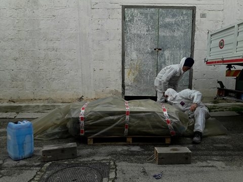 - Imballaggio dei materiali pericolosi con uno strato di polietilene di adeguato spessore come da normativa vigente, etichettati e caricati su mezzo idoneo autorizzato al trasporto all’impianto di stoccaggio;